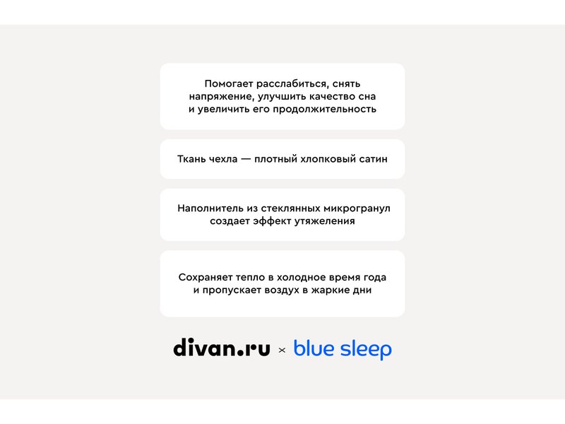 Гравитационное одеяло Blue Sleep - это не обычное одеяло, это настоящее спасение для тех, кто страдает от бессонницы и проблем со сном. За счёт увеличенного веса оно помогает расслабиться, снять напряжение, улучшить качество сна и увеличить его продолжительность. Ещё одним преимуществом утяжелённого одеяла является то, что оно помогает улучшить кровообращение и повысить тонус мышц. Благодаря своей структуре, которая обеспечивает циркуляцию воздуха, одеяло не только сохраняет тепло в холодное время года, но и позволяет телу дышать в жаркую погоду. Это делает его идеальным выбором для использования в любое время года.