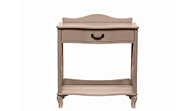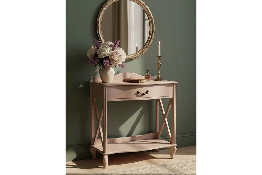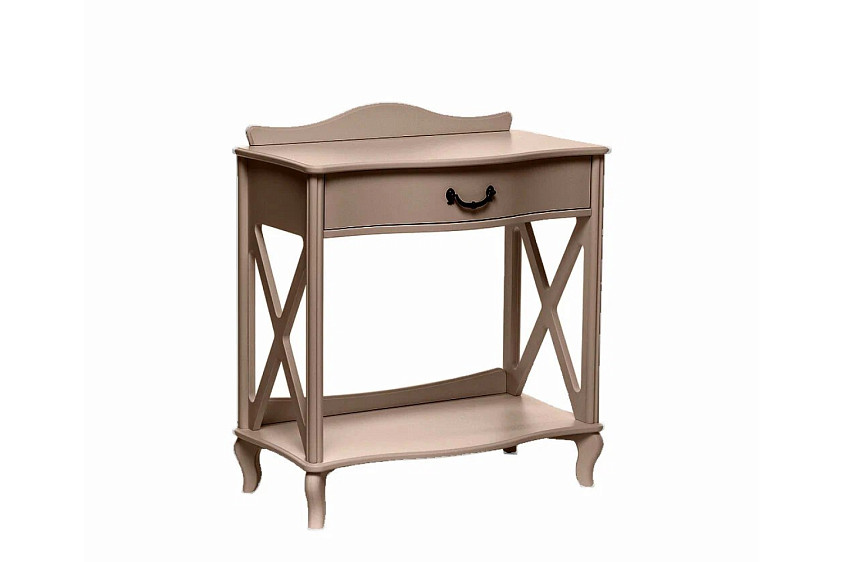 Узкий консольный столик «Джульетта» в цвете мокко предназначен для декоративных целей — на небольшую поверхность можно поместить вазу, сувенир, необычную статуэтку. Внешний вид изделия соответствует интерьерному стилю прованс. Бежевый оттенок, фигурная форма, изогнутые ножки, фурнитура в цвете «античная бронза» превосходно впишутся и в классическую обстановку. Основание модели выполнено из МДФ, боковины и столешница — из ЛМДФ, прочие детали изготовлены из шпона натурального ясеня. Изюминка консоли — боковые части в виде декоративных элементов фахверков. В компактном ящике с бесшумным механизмом выдвижения можно хранить любимые книги, косметику, украшения, очки, различные мелочи.
