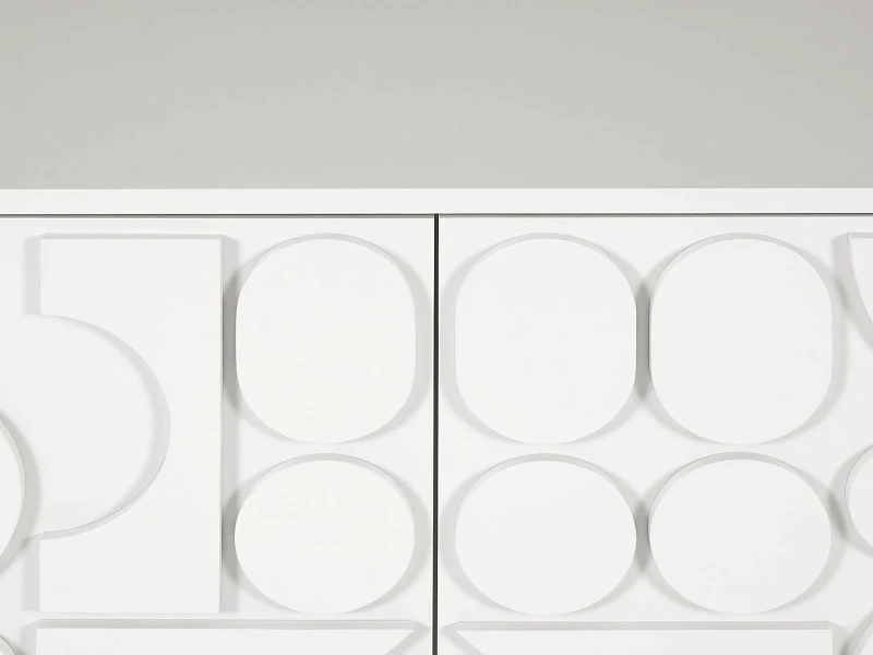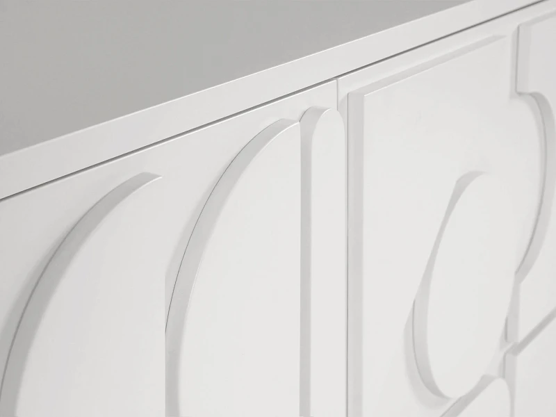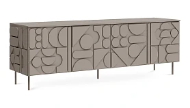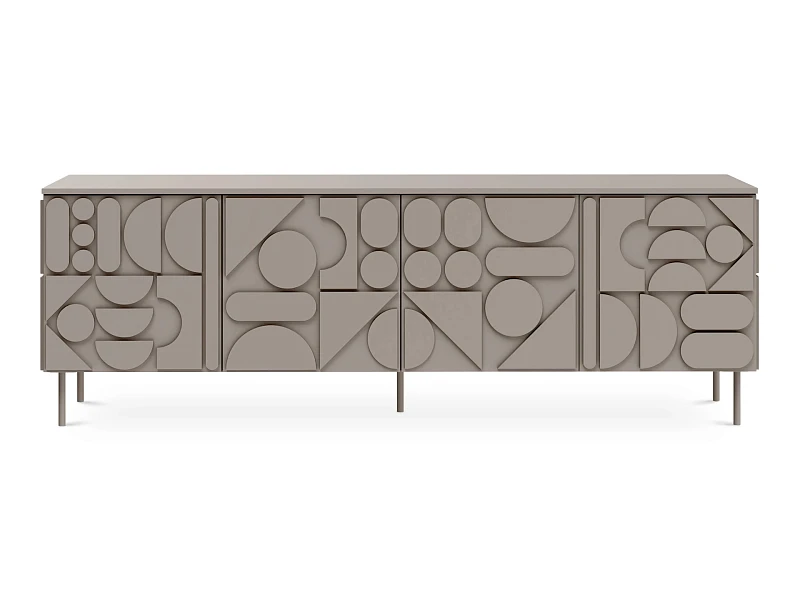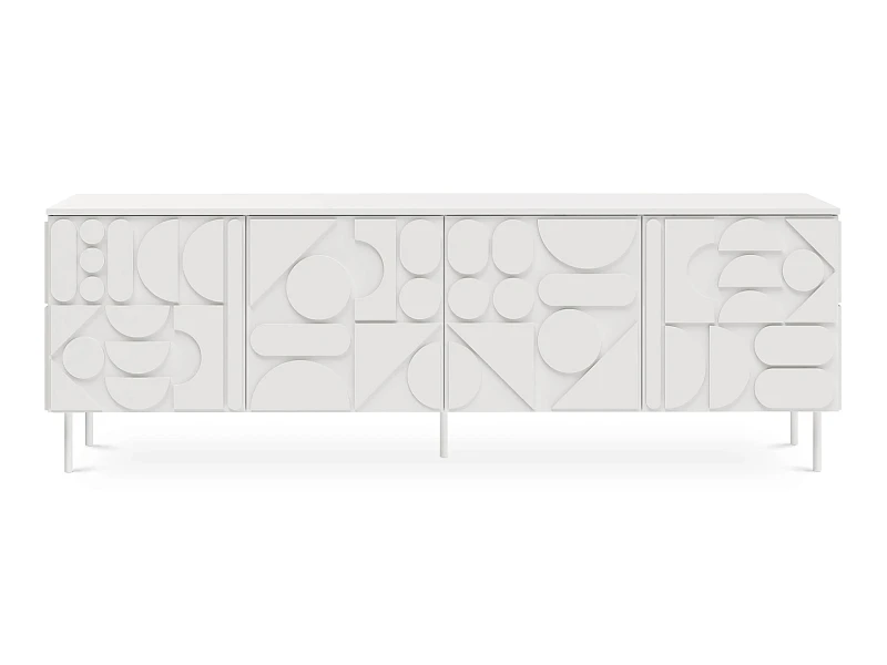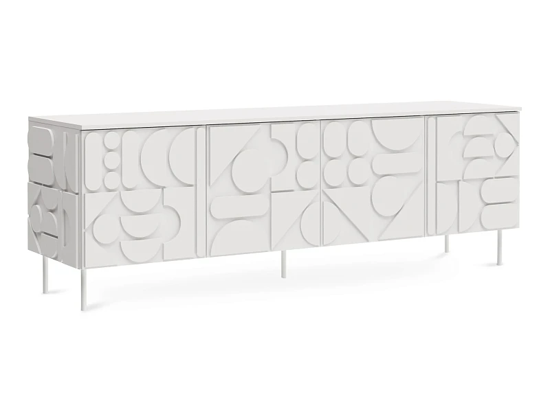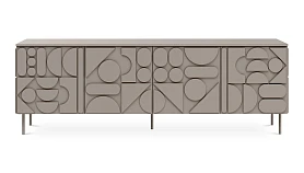 Тумба с четырьмя распашными дверями, расположенными в ряд. За каждой дверью отделение со съёмной полкой. Перестановка полок по высоте не предусмотрена.