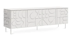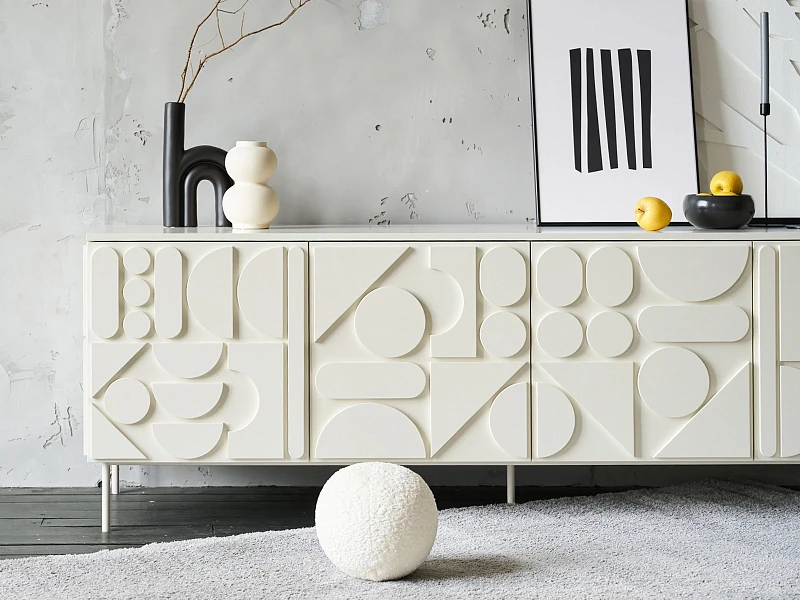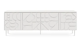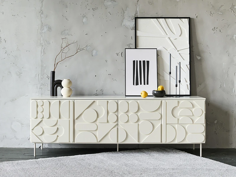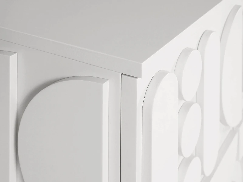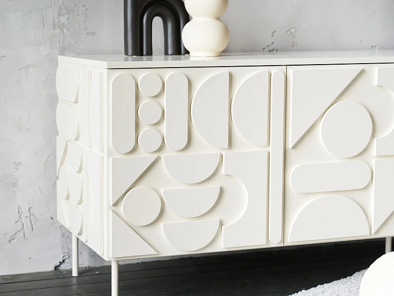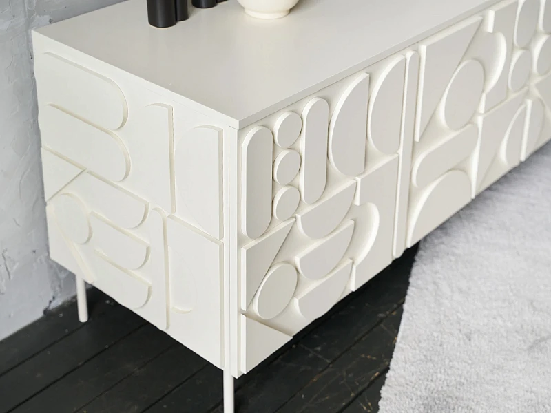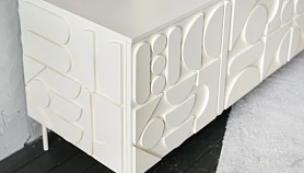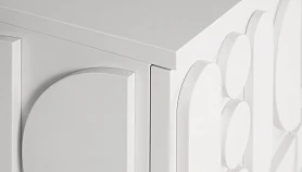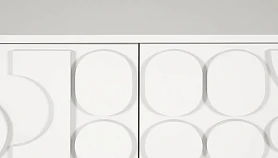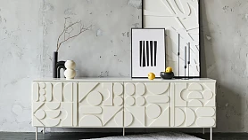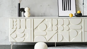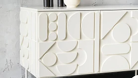Milton — линейка корпусной мебели для хранения с динамичным характером. Яркой чертой дизайна являются геометрические фигуры, закреплённые на фасадах и боковых стенках. Они придают изделиям рельефность, оригинальность, выразительность. Серванты, комоды, тумбы напоминают объёмные 3-D головоломки. Архитектура которых строится на комплиментарности контрастов. Колоритный «верх» балансирует на изящных ножках из металла. Фасады без ручек открываются с помощью механизма «нажал-открыл».