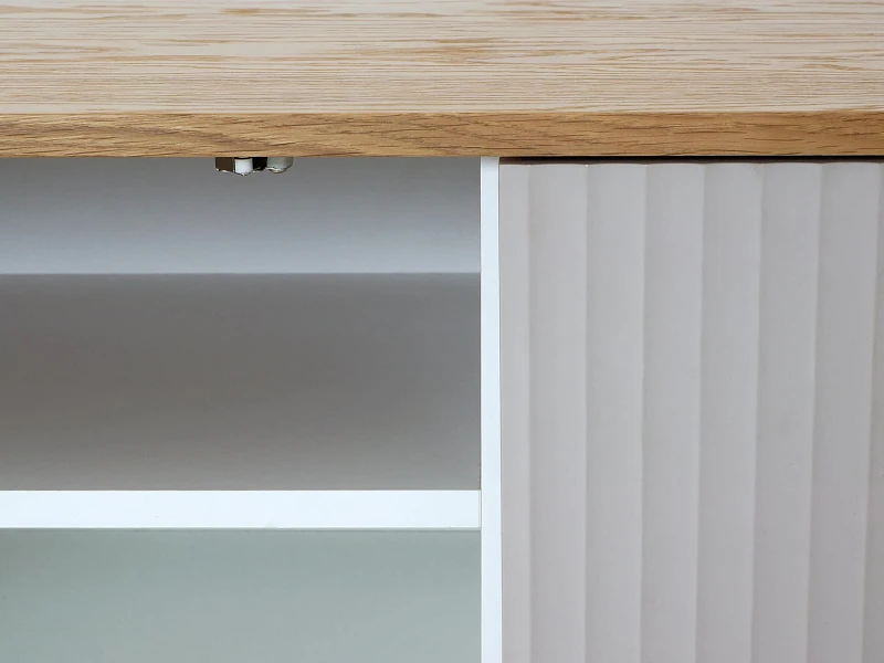 Тумба Mikko разделена вертикальной перегородкой на два отделения, которые закрываются распашными дверями. В каждом отделении по одной съёмной полке, перестановка полки по высоте не предусмотрена.