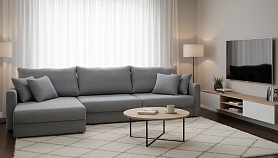Низкая посадка и лаконичные формы создают эффект дорогой дизайнерской мебели, а нейтральный цвет делает диван идеальной базой для любых текстильных акцентов.