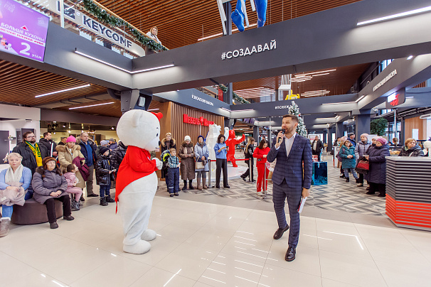 Событие прошло по-новогоднему весело! Гости собирались на первом этаже, где под нарядной ёлкой красовались подарки. Детей развлекал огромный добрый медвежонок, с которым каждый хотел сфотографироваться в креативной фотозоне.