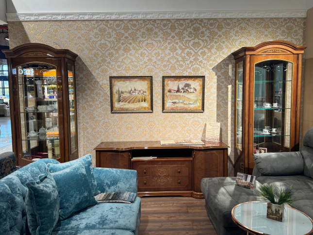 Фасад облицован шпоном корня ценных пород дерева в технике интарсия. Витрина выполнена с высокоглянцевым лаковым покрытием.